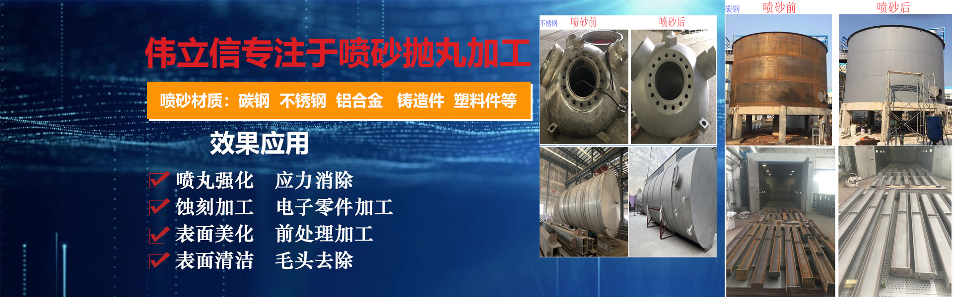 武漢偉立信機械設備有限公司(噴砂熱線:18186495283)是一家從事表面涂裝和表面清理設備的廠家,公司位于武漢市武昌區(qū)。是一家集表面涂裝和表面清理設備科研、開發(fā)、生產(chǎn)、銷售、服務于一體的綜合型企業(yè)。 公司自創(chuàng)建以來,一直秉持認真、負責的態(tài)度,以其科學而嚴密的管理,先進而不斷創(chuàng)新的技術,致力于表面處理設備的研制和開發(fā),主要產(chǎn)品有:手動噴砂機、自動噴砂機、開放式加壓噴砂機、干濕式噴砂機及大型噴砂房,拋丸機,除塵設備,另可根據(jù)客戶要求定做。低價經(jīng)營各類噴砂磨料:玻璃珠、鋼砂、鋼丸、不銹鋼丸、鋼絲切丸···